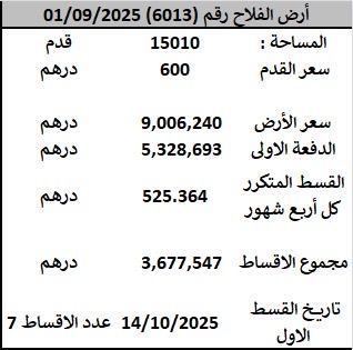 أرض للبيع في الفلاح رقم 6013 المساحة 15010 قدم سعر القدم 600 درهم اجمالي السعر 9006240 درهم الدفعة الأولى 5328693 درهم القسط المتكرر 525364 درهم كل أربعة أشهر اجمالي الاقساط 3677547 درهم عدد الاقساط 7 تاريخ أول قسط 14102025