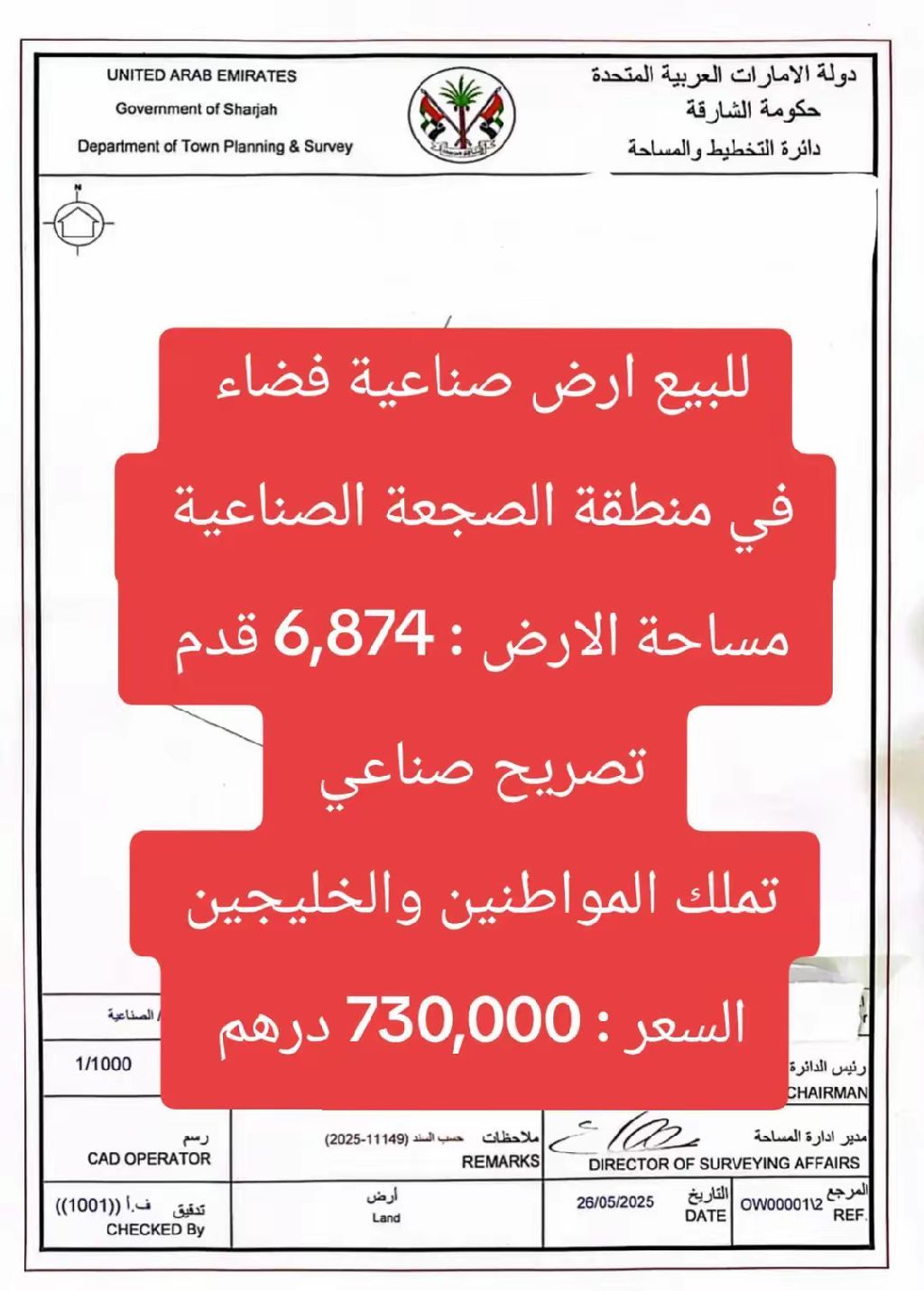 للبيع أرض صناعية فضاء في منطقة الصجعة الصناعية مساحة الأرض 6874 قدم تصريح صناعي تملك المواطنين والخليجين السعر 730000 درهم