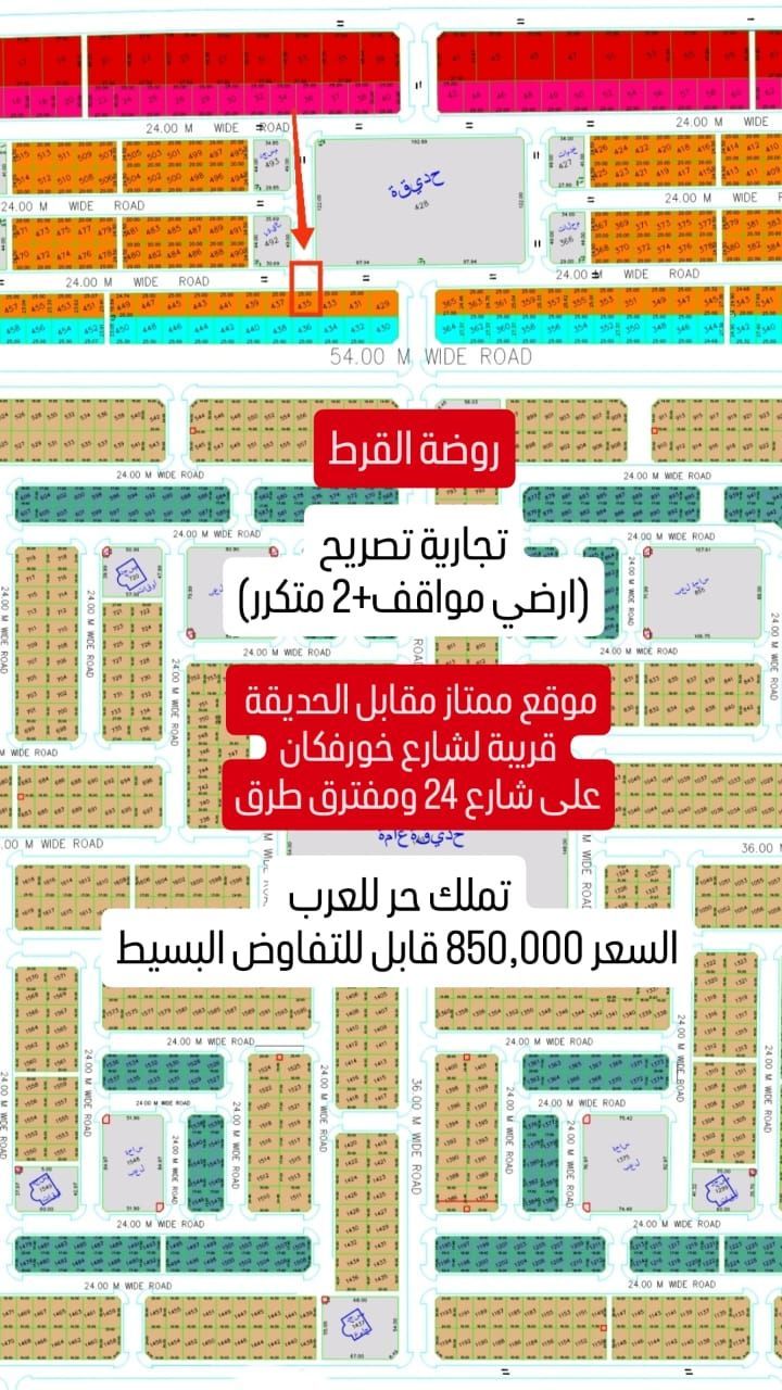 للبيع أرض في روضة القرط تجاريه تصريح أرضي مواقف + 2 متكرر موقع ممتاز مقابل الحديقة قريبة لشارع خور فكان على شارع 24 ومفترق طرق تملك حر للعرب السعر 850 ألف درهم