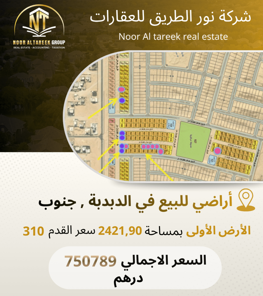 اليك الترجمة الدقيقة الى الانجليزية Noor Al Tareeq real estate presents to you a golden investment opportunity in Al Dabdaba - South. Property Details Location Al Dabdaba South Total Area 2421.90 SqFt Price per SqFt AED310Total Price AED750789Why this opportunity Highly demanded investment location Competitive price for the area Ideal for
