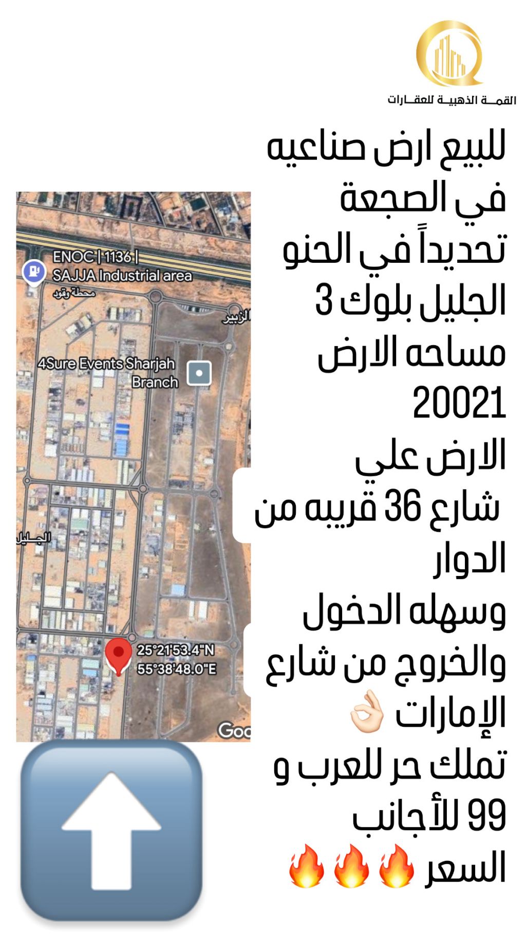 للبيع أرض صناعية في الصجعة تحديدا في الحنو الجليل بلوك 3 مساحة الأرض 20021 الأرض على شارع 36 قريبة من الدوار وسهله الدخول والخروج من شارع الامارات العابر تملك حر للعرب و99 للأجانب