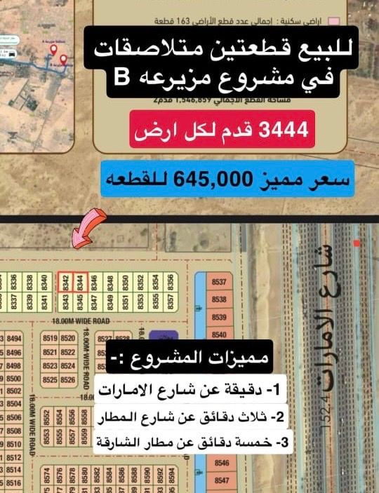 For sale two adjacent residential plots in the Muziraa B project, a strategic location close to the most vital roads. Area per piece 3444 feet - Price per item AED645000 Distinctive location and close to services One minute from Emirates Road - 3 minutes from Airport Road - 5 minutes from Sharjah airport An excellent opportunity to own or invest in an area that grows quickly at affordable