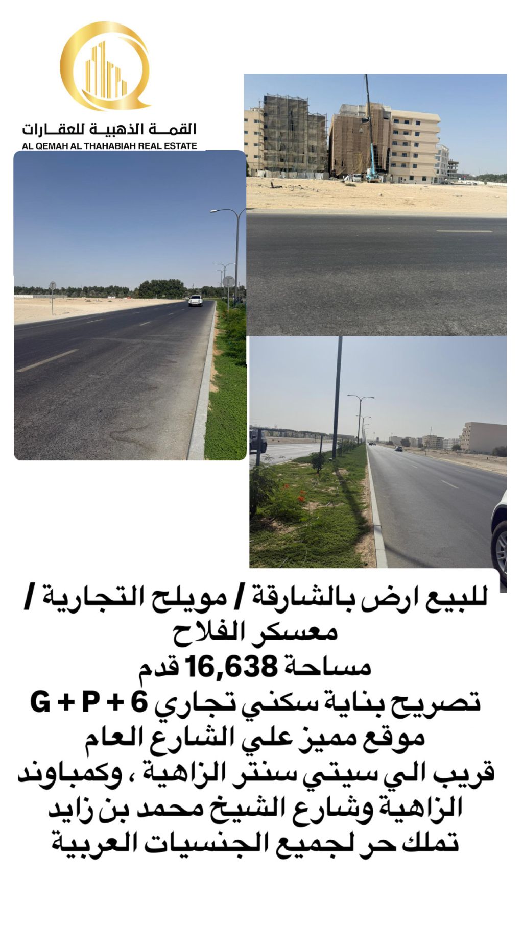 للبيع أرض في الشارقة / مويلح التجارية / معسكر الفلاح مساحة 16638 قدم تصريح بناية سكني تجاري G P 6 موقع مميز علي الشارع العام قريب الى سيتي سنتر الزاهية، وكمبوند الزاهية وشارع الشيخ محمد بن زايد تملك حر لجميع الجنسيات العربية مطلوب 670 درهم للقدم