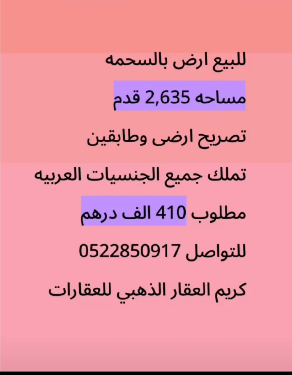 للبيع قطعة أرض في السحمة مساحة 2635 قدم مربع تصريح فيلا أرضي وطابقين تملك حر جميع الجنسيات العربية مطلوب 410 ألف درهم للتواصل والاستفسار كريم العقار الذهبي للعقارات
