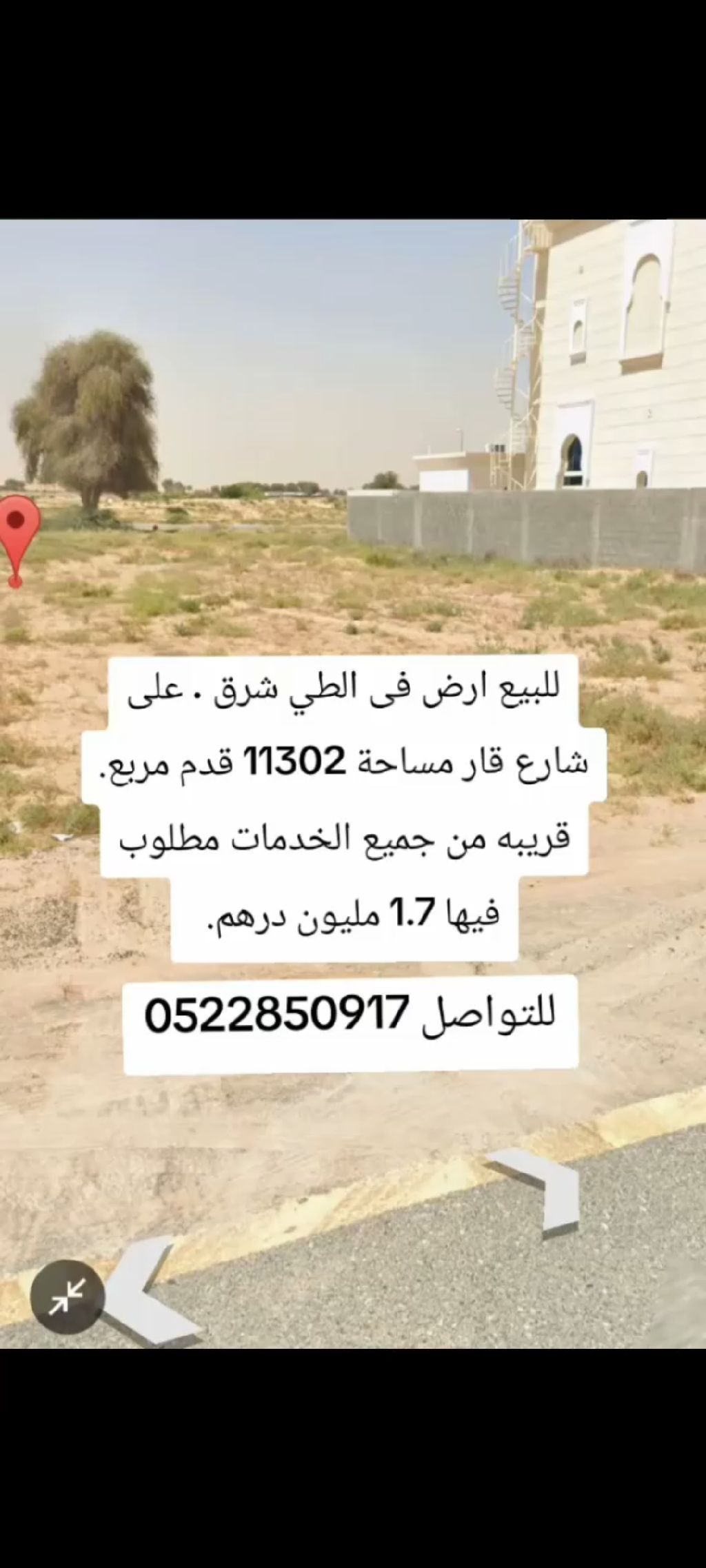 للبيع أرض في الطي شرق. على شارع قار مساحة 11302 قدم مربع. قريبة من جميع الخدمات مطلوب فيها 1.7 مليون درهم. مباشر مع المالك