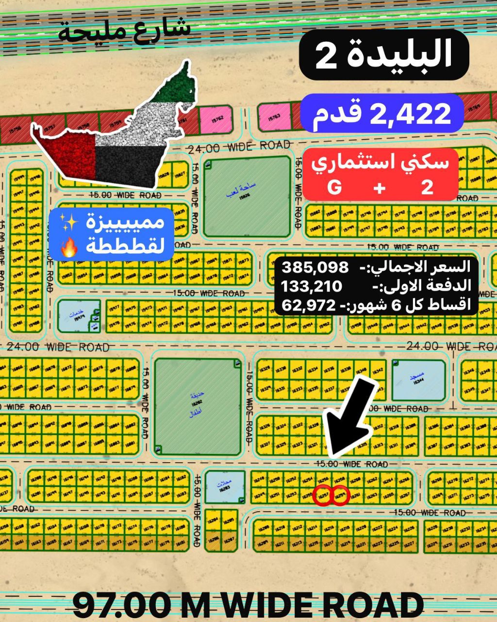 Residential land for sale in Sharjah, Al Baleedah area. Large plot, freehold ownership for all Arab nationalities. Hurry and reserve your plot now Contact Noor Al Tareeq real estate Company, your best choice. Reserve your plot now