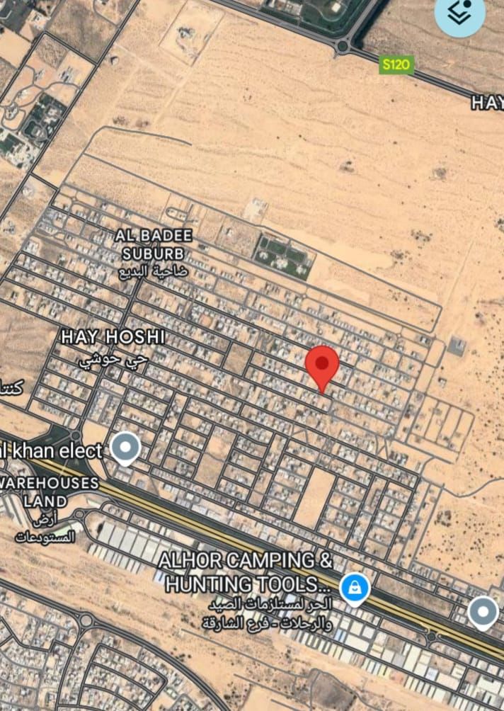 Prime land for sale in Al - Hawshi area, on the corner of two 18 - meter streets, close to the mosque, park, and amenities. Area 9687.52 SQM asking price AED1900000 Al - Mushir real estate, Sharjah - East - Behind the Saudi German Hospital