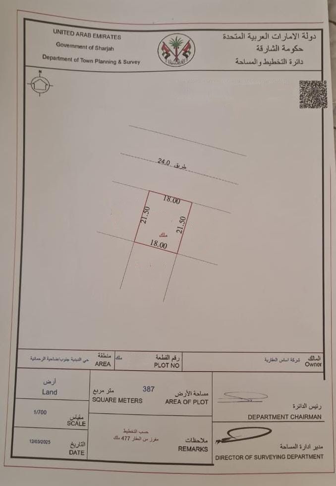 للبيع أرض سكنية في إمارة الشارقة المنطقة حي الدبدبه جنوب (بساتين الزبير سابقا) ضاحية الرحمانية مساحة الأرض 387 متر مربع مساحة الأرض 4165 قدم مميزات الأرض. البيع عن طريق الاقساط (تكملة اقساط لمدة ثلاث سنوات) تملك حر لجميع الجنسيات العربية، تصريح بناء فيلا أرضي + طابقين، البنية التحتية مكتملة وعلى شارع جار، ثاني قطعة أرض من الحديقة والمسجد، شوارع جار، الموقع جدا ممتاز والسعر ممتاز مطلوب