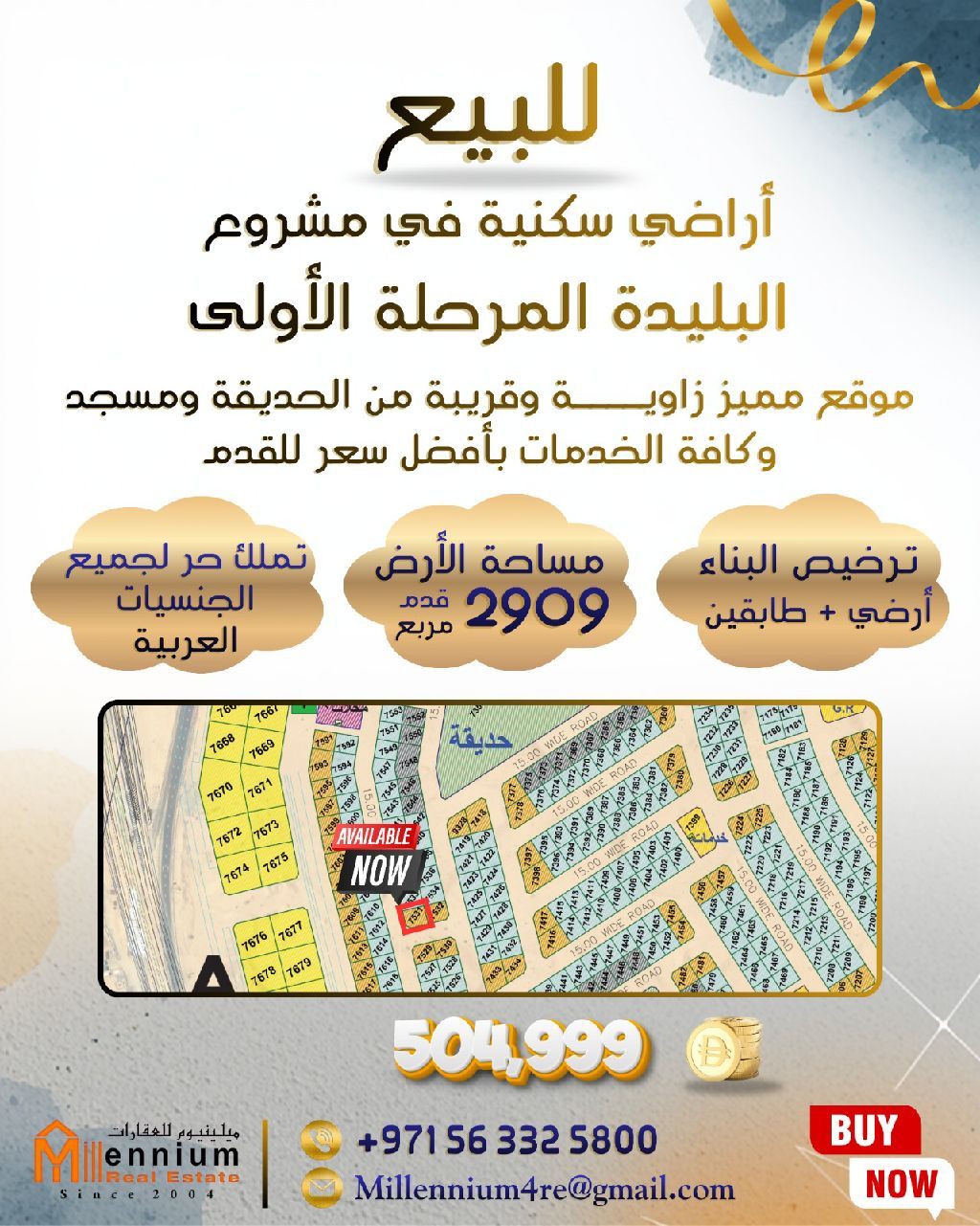 للبيع قطعة أرض مميزة على زاوية في البليدة المرحلة الأولى مساحة الأرض 2909 قدم مربع تصريح بناء أرضي + طابقين تملك حر لجميع الجنسيات العربية السعر المطلوب 504999 درهم اماراتي للاستعلام والاستفسار يرجى التواصل
