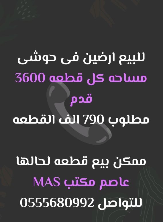 للبيع أرضين في الحوشي مساحة كل قطعة 3600 قدم مطلوب 790 ألف القطعة ممكن بيع قطعة لحالها مباشر من المالك