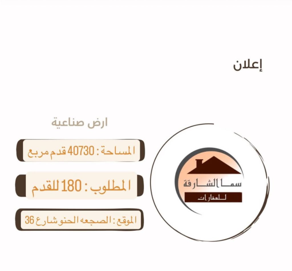 للبيع أرض صناعية بالحنو الصجعة مساحة 40730 قدم على شارع 36 بسعر 180 درهم للقدم