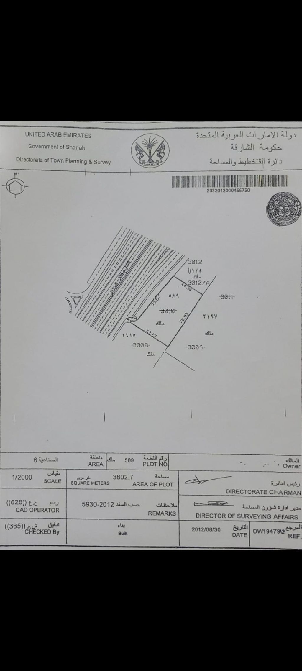 للبيع أرض في الشارقة الصناعية 6 تشمل الانطشة تجاري مكاتب صناعي المساحة 3802.7 السعر 10 مليون قابل للتفاوض