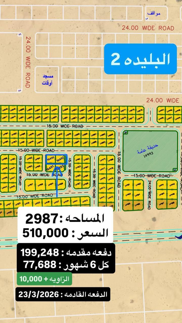 For sale two residential lands - Blida 2, Sharjah - Area 2987 ft per piece - Price Regular item AED510000 - Corner piece AED520000 - Advance payment AED199248 - Next installment 23/ 2026 - Premiums AED77688 77 months