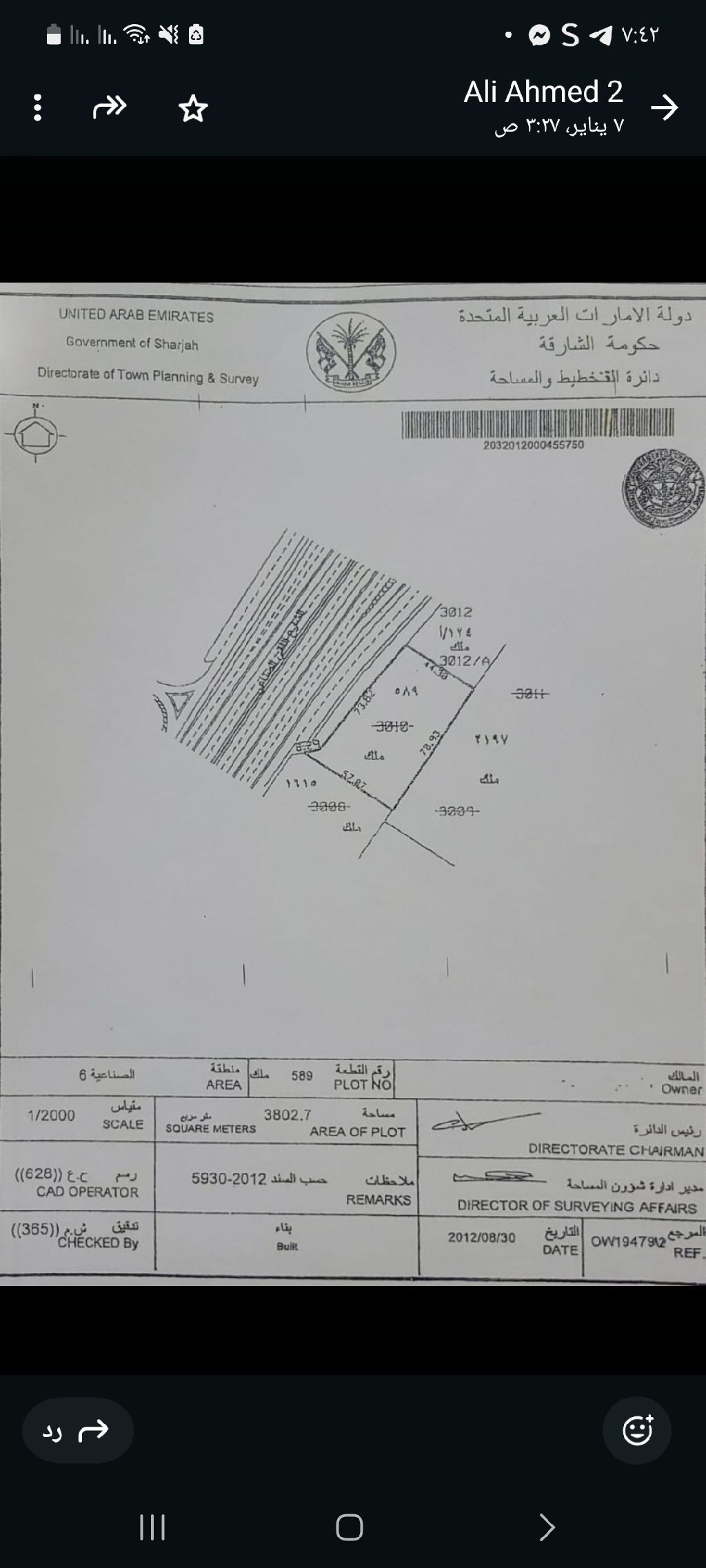 أرض للبيع في الصناعية الشارقة 6 رقم القطعة 589 مساحة الأرض 3802.7 متر مربع الاستعمال تجاري مكاتب صناعي السعر 10 مليون قابل للتفاوض Land for sale in Sharjh Area 6 Plot number 589 Building primit Commerical Offices Industrial Asking 10M (negotiable)