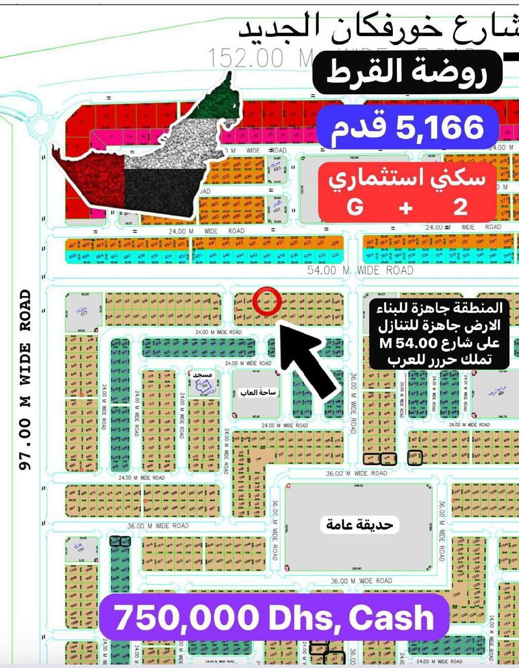 للبيع قطعة أرض سكني في إمارة الشارقة بمنطقة روضة القرط ضاحية الرويضات مساحة 5166 قدم تصريح أرضي + طابقين موقع مميز على شارع بعرض 54م قريب المسجد والحديقة والخدمات قريب شارع خور فكان تملك خليجي والأخوه العرب السعر 750000 درهم