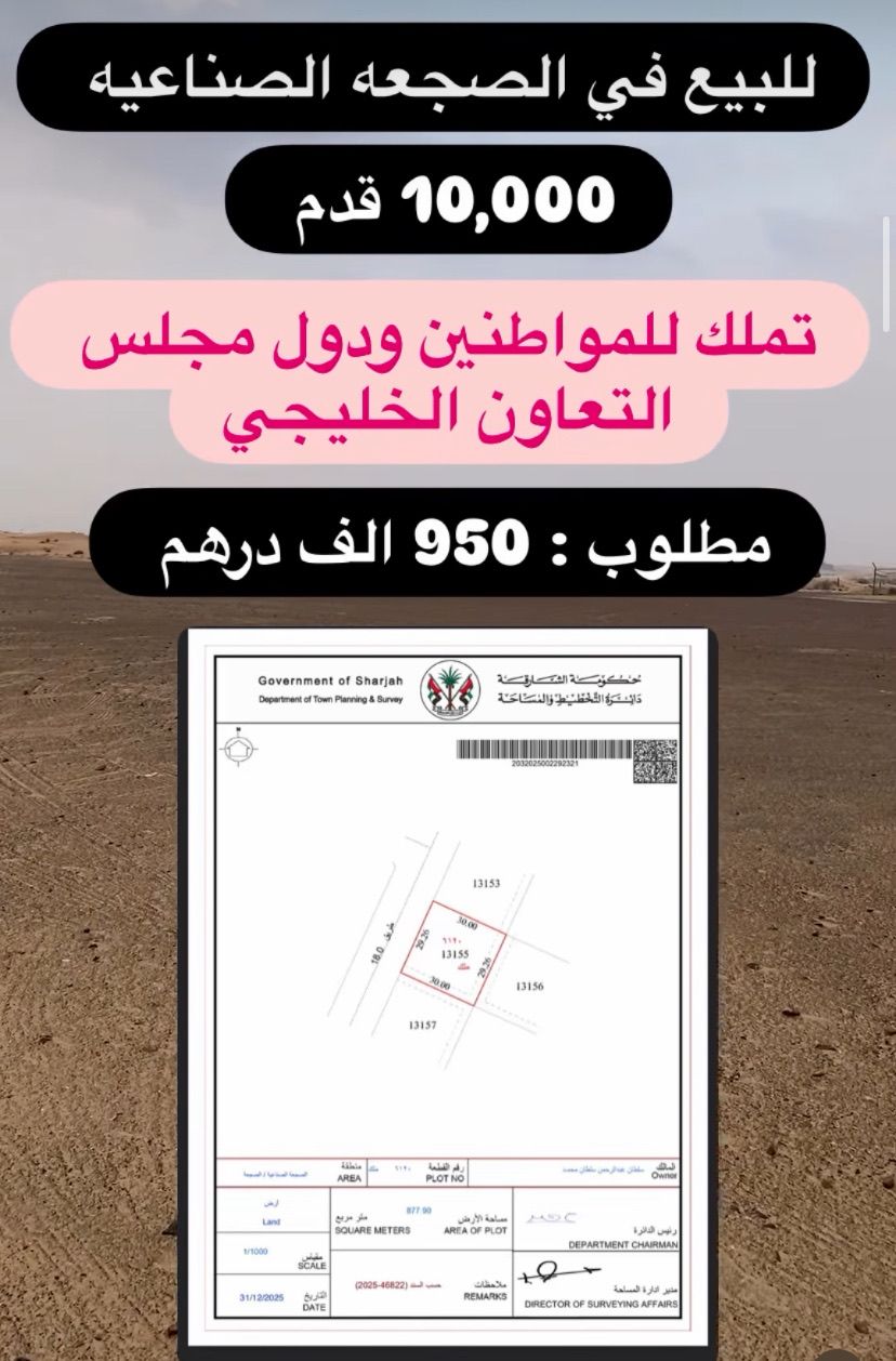 للبيع في الصجعة الصناعية في الشارقة أرض صناعية مساحة 10000 قدم مربع تملك للمواطنين والخلجين فقط مطلوب 950 ألف درهم