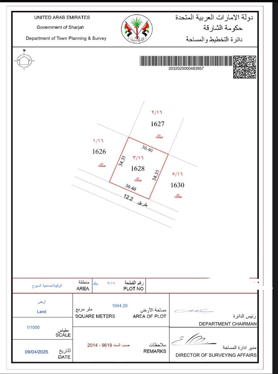 Residential land for sale in Al Ruqaybah (Al Tayy) area, owned by Arabs. Behind the new Sharjah Mosque. Building permit for two villas. Land area 11240 SqFt. Price AED1650000