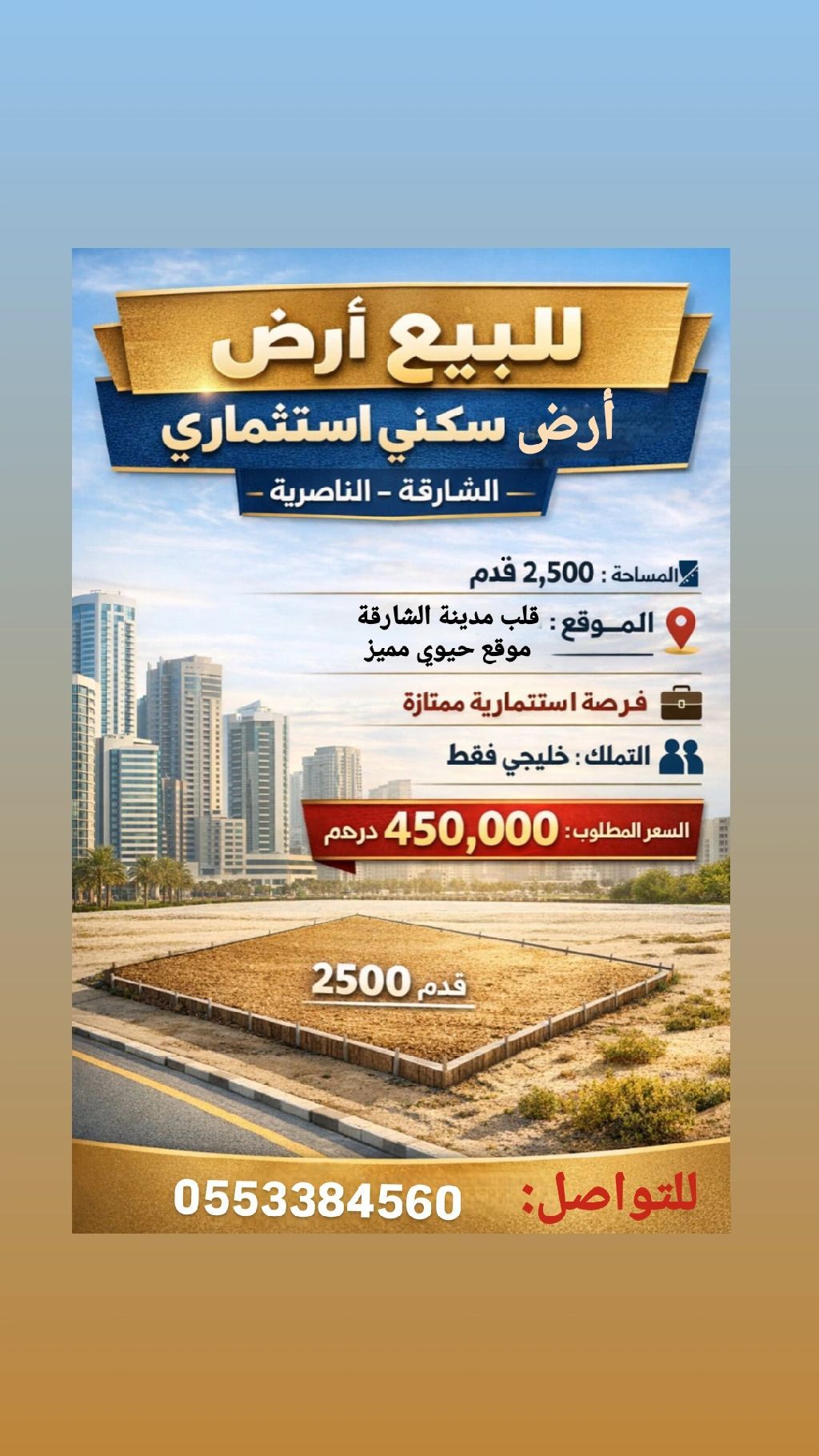 Residential Investment Land for sale - Sharjah/ Al Nasiriyah Area 2500 SqFt Location Heart of Sharjah - Prime and vibrant location Excellent investment opportunity Ownership GCC nationals only asking price AED450000