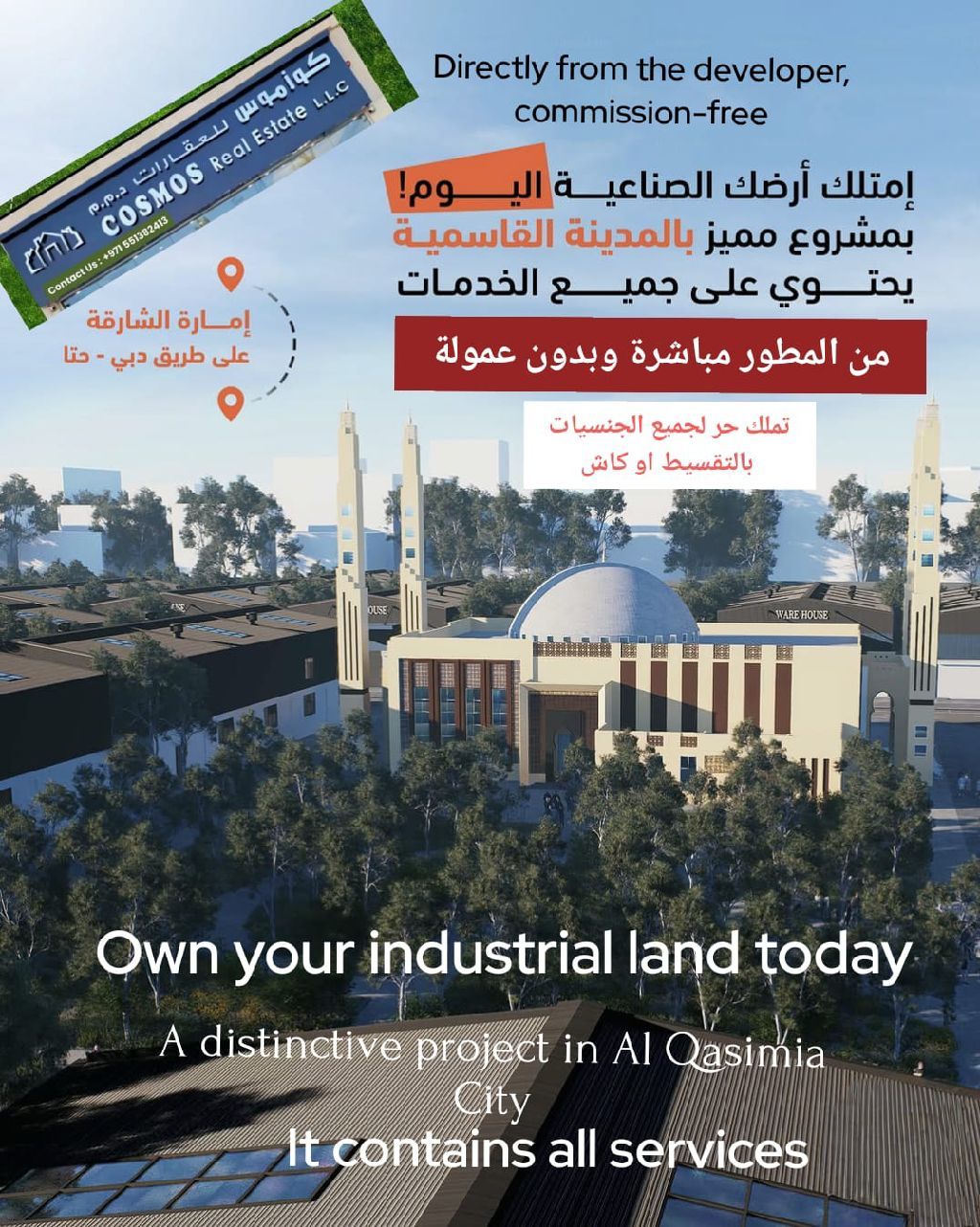 Own your Industrial land today in Al Qasimia City. Freehold ownership for all Arab and foreign nationalities. Sharjah Strategic location on the Dubai - Hatta Road with integrated infrastructure including all the services necessary for your business growth. Available Use Types Commercial/ Industrial Land (Ground + Mezzanine + 1) Industrial Land (Ground + Mezzanine) An investment that guarantees