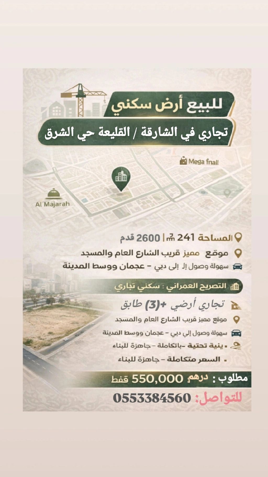 For sale Residential/ commercial land in Sharjah/ Al Qulaya'ah, Al Sharq neighborhood. Area 241 SQM (2600 square feet) Prime and strategic location near the main road and mosque. easy access to Dubai, Ajman, and the city center. Essential services and facilities. Complete infrastructure ready for construction. Building permit Residential/ Commercial, ground floor + 3 floors. asking price