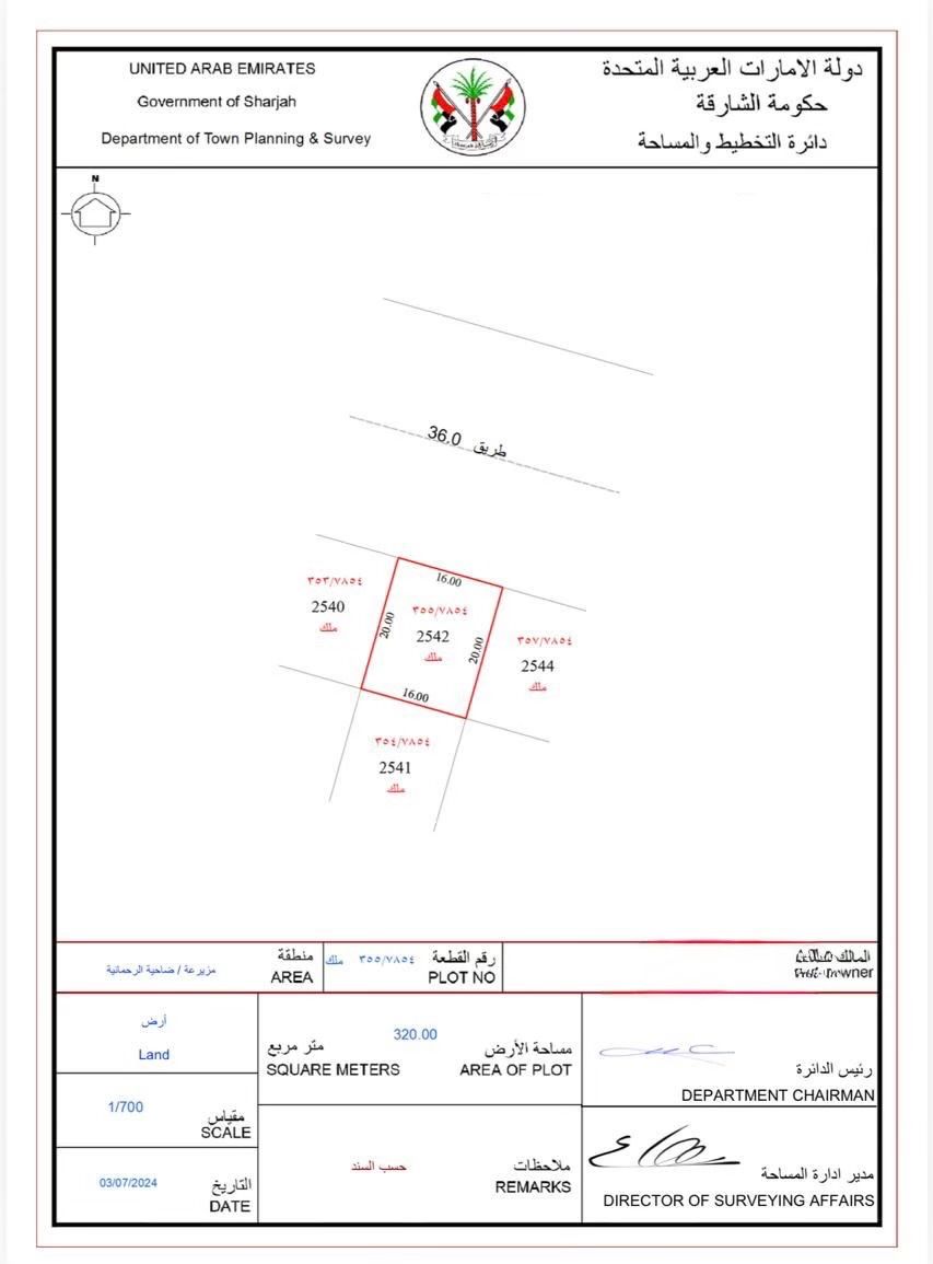 For sale Residential Land - Mazira, Al Rahmaniyah - Sharjah - 3444 Feet ( G 2) Residential land for sale in a privileged location in Mazira - Rahmaniyah Building authorisation ground villa + double floors - On a main street with a width of 36 metres - Close to a mosque, a garden and all services - Close to Emirates Transit Road and Al Dhaid Street - Close to Rahmaniyah Mall - Close to the American