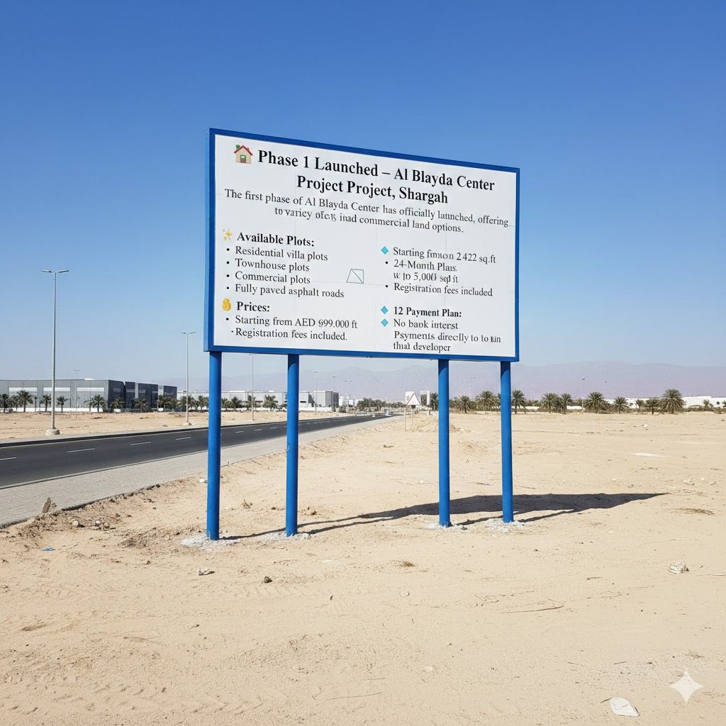 Phase 1 Launched - Al Blayda Center Project, Sharjah The first phase of Al Blayda Center has officially launched, offering a variety of residential and commercial land options with fully paved asphalt roads. Available Plots Residential villa plots Townhouse plots Commercial plots Asphalt roads throughout the project Plot Sizes From 2422 SqFt Up to 5000 SqFt Prices Starting from AED699000 Registration