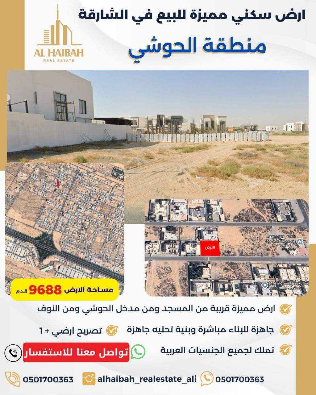 فرصة رائعة لامتلاك أرض في موقع هادئ ومميز، قريبة من المسجد ومن مدخل الحوشي ومنطقة النوف، مع بنية تحتية جاهزة وجاهزة للبناء مباشرة. تفاصيل الأرض المساحة 9688 قدم مربع - تصريح أرضي + 1 - تملك لجميع الجنسيات العربية موقع مناسب للسكن والاستثمار في منطقة تشهد تطورا مستمرا وقريبة من الخدمات والطرق الرئيسية