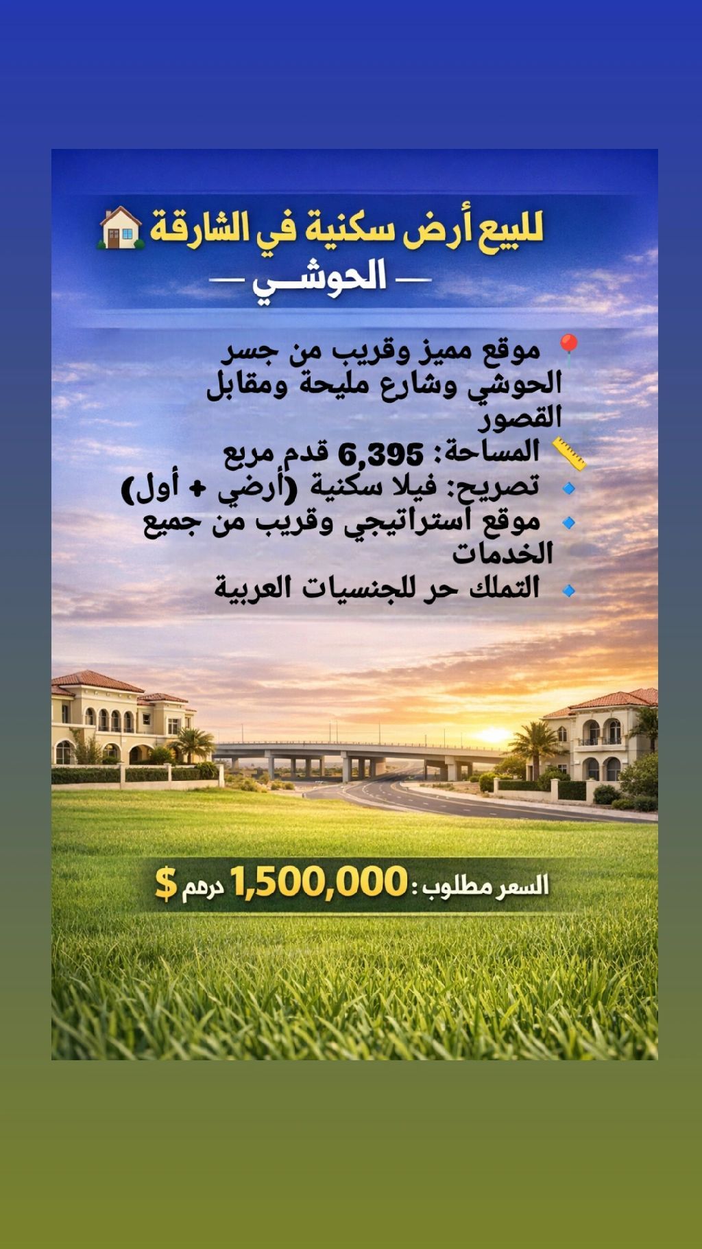 للبيع أرض سكنية في الشارقة - الحوشي موقع مميز وقريب من جسر الحوشي وشارع مليحة ومقابل القصور المساحة 6395 قدم مربع تصريح فيلا سكنية (أرضي + أول) موقع استراتيجي وقريب من جميع الخدمات التملك حر للجنسيات العربية السعر المطلوب 1500000 درهم