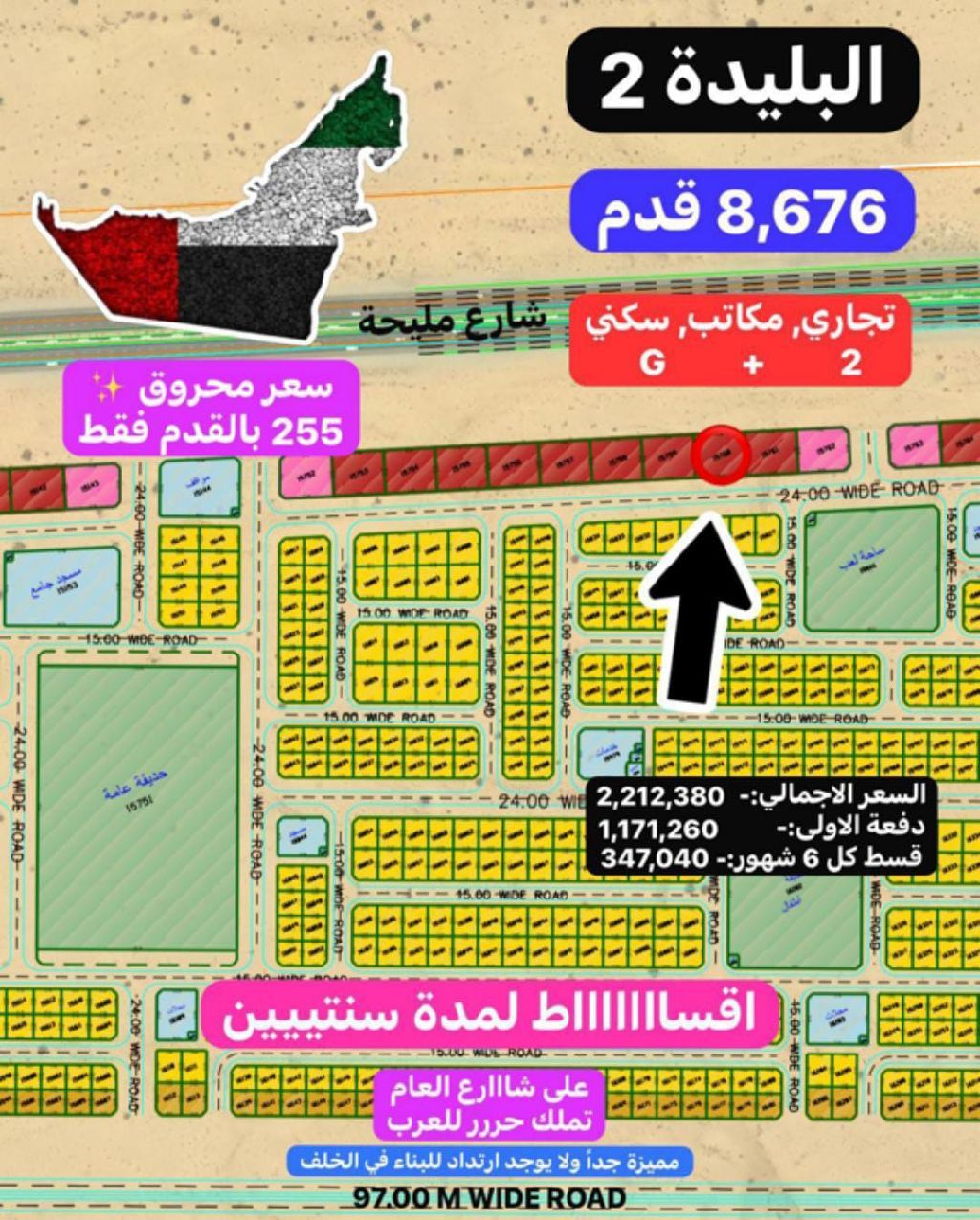 للبيع قطعة أرض تجاري في إمارة الشارقة بمنطقة البليدة 2 ضاحية البطائح مساحة 8676 قدم تصريح أرضي + طابقين موقع مميز قريب المسجد والحديقة والخدمات على شارع العام مباشرة شارع مليحة تملك خليجي والأخوه العرب السعر 2212380 درهم اقساط سنتين