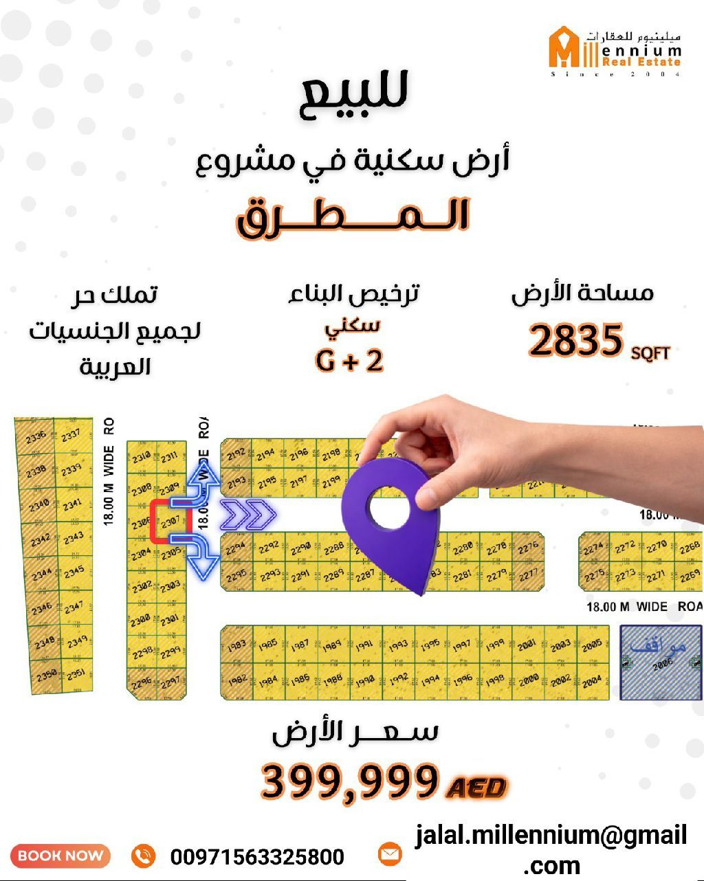 أرض سكنية للبيع في الشارقة، في مشروع المطرق موقع مميز على 3 شوارع مساحة الأرض 2835 قدم مربع سعر الأرض الواحدة 399999 درهم اماراتي تملك حر لجميع الجنسيات العربية تصريح سكني أرضي + 2 ما عليك سوى التواصل معنا وسنزودك بجميع التفاصيل عبر رقم الهاتف أو البريد الألكتروني