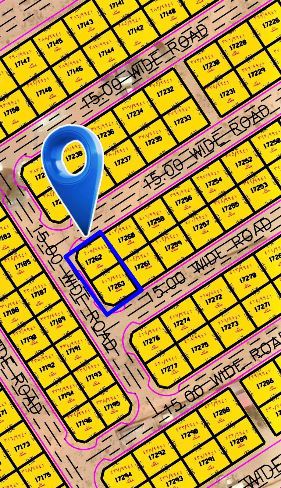 للبيع قطعة أرض بالبليدة (3) مساحة القطعة 2529) قدم السعر للقطعة 440000) درهم دفعة نقدي 146636) درهم متبقي (4) شيكات قيمة كل شيك (73341) علي سنتين