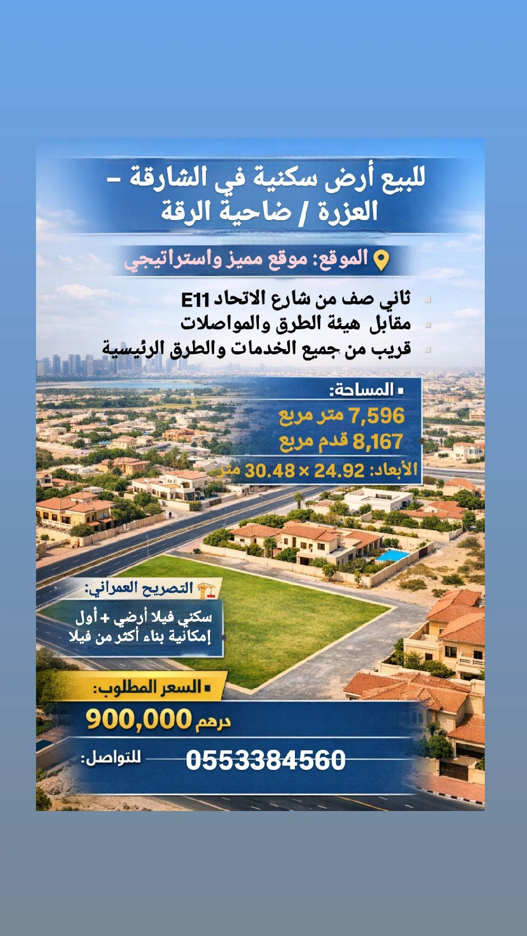للبيع أرض سكنية في الشارقة - العزرة / ضاحية الرقة الموقع موقع مميز واستراتيجي ثاني صف من شارع الاتحاد E11 مقابل هيئة الطرق والمواصلات قريب من جميع الخدمات والطرق الرئيسية المساحة 7596 متر مربع 8167 قدم مربع الأبعاد 24.92*30.48 متر التصريح العمراني سكني فيلا أرضي + أول امكانية بناء أكثر من فيلا السعر المطلوب 900000 درهم