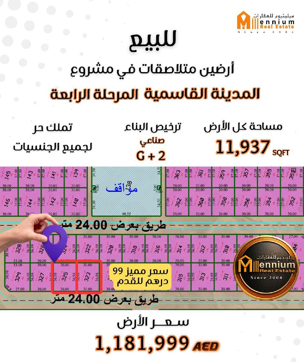 قطعتان أرض متجاورتان للبيع في الشارقة، في مدينة القاسمية المرحلة الرابعة موقع مميز على شارع عرضه 24 مترا، وقريب من جميع الخدمات المساحة الاجمالية للأرض 11937 قدم مربع سعر القطعة الواحدة 1181999 درهم اماراتي ملكية حرة لجميع الجنسيات رخصة صناعية طابق أرضي + طابقين تواصلوا معنا وسنزودكم بكافة التفاصيل عبر الهاتف أو البريد الألكتروني