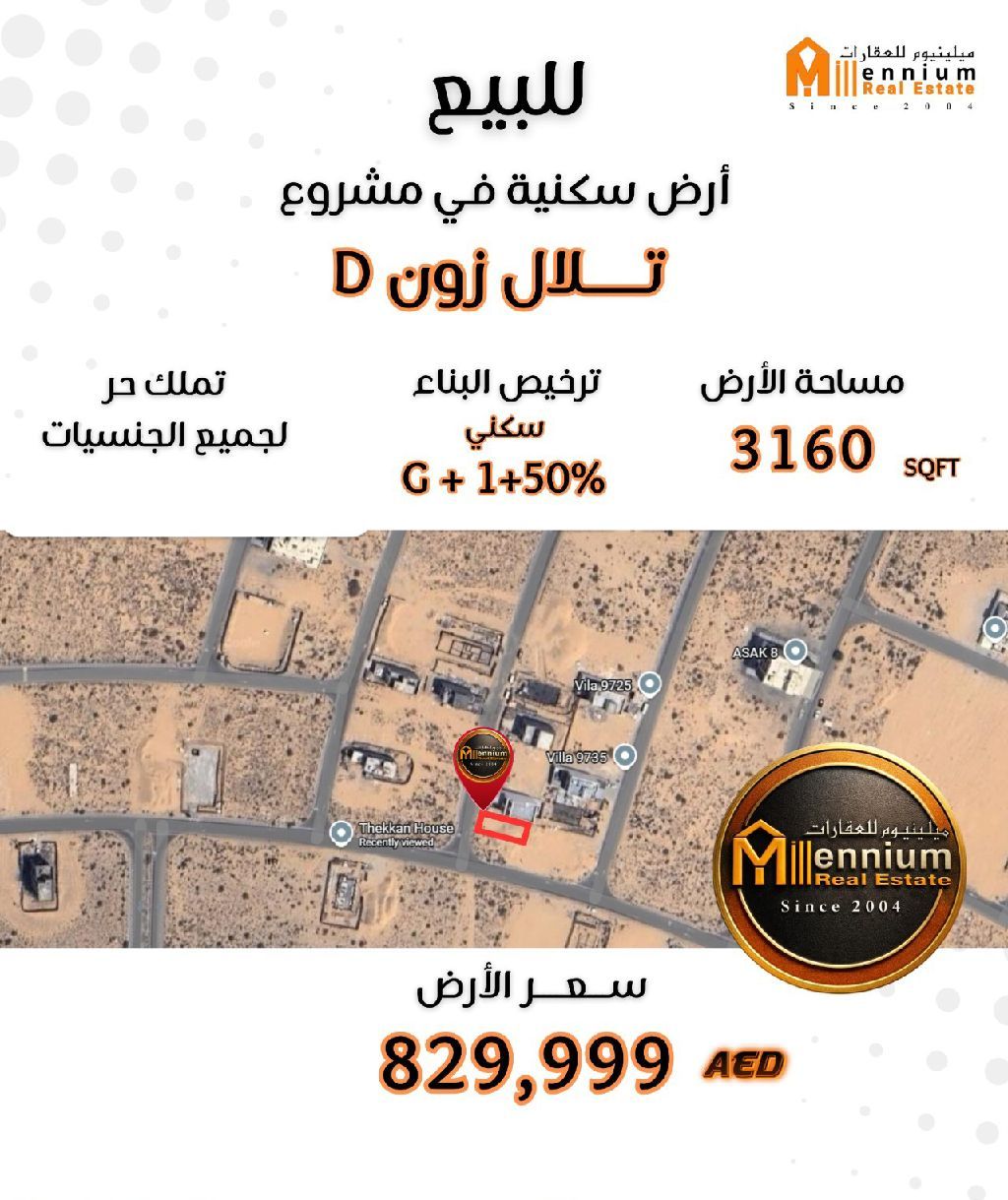 أرض سكنية للبيع في الشارقة، ضمن مشروع تلال، المنطقة د موقع متميز مساحة الأرض 3160 قدم مربع سعر الأرض 829999 درهم اماراتي ملكية حرة لجميع الجنسيات العربية والغير عربية رخصة بناء تاون هاوس سكني أرض + 1 + 50 من السطح تواصلوا معنا وسنزودكم بكافة التفاصيل عبر الهاتف عقارات - الشارقة