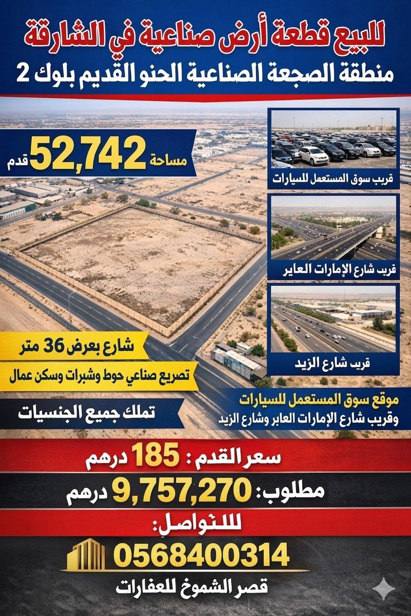 للبيع قطعة أرض صناعية في الشارقة منطقة الصجعة الصناعية الحنو القديم بلوك 2 مساحة 52742 قدم شارع بعرض 36 متر تصريح صناعي حوط وشبرات وسكن عمال موقع ممتاز جدا قريب سوق المستعمل للسيارات وقريب شارع الامارات العابر وشارع الزيد تملك جميع الجنسيات سعر القدم 185 درهم مطلوب 9757270 درهم للتواصل / قصر الشموخ للعقارات