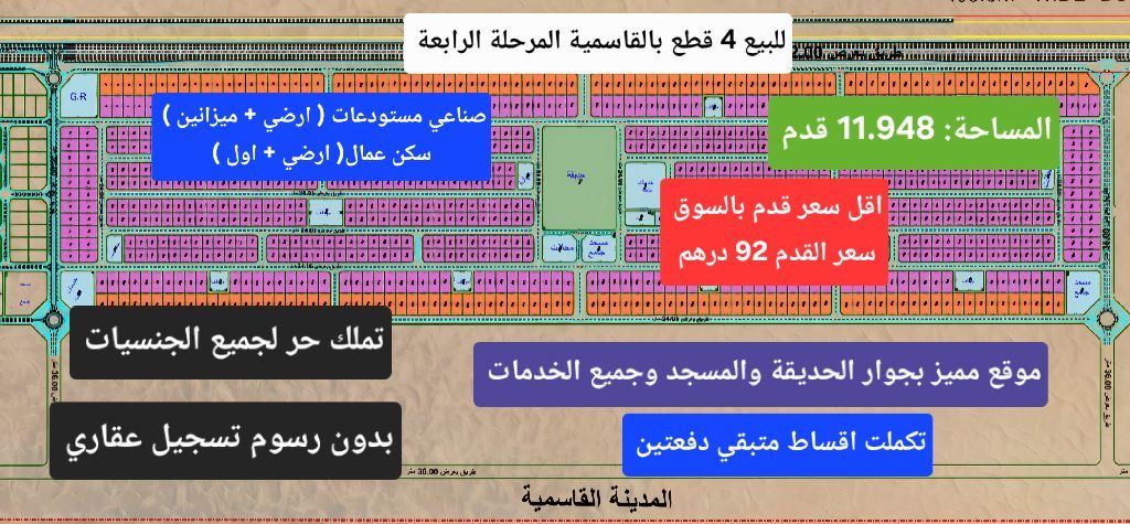 للبيع 4 قطع أراضي صناعي بالمدينة القاسمية المرحلة (الرابعة) مساحة القطعة 11948 قدم الاستعمال والاستخدام صناعي مستودعات ومكاتب جزئية ضمن المستودعات / سكن عمال التصريح صناعي مستودعات (أرضي + ميزانين) وسكن عمال (أرضي + أول) تملك حر لجميع الجنسيات العربية والأجنبيه تكملت اقساط دفعة مقدمة للمالك والباقي علي 2 اقساط المطلوب 92 درهم للقدم للتواصل / قصر الشموخ للعقارات