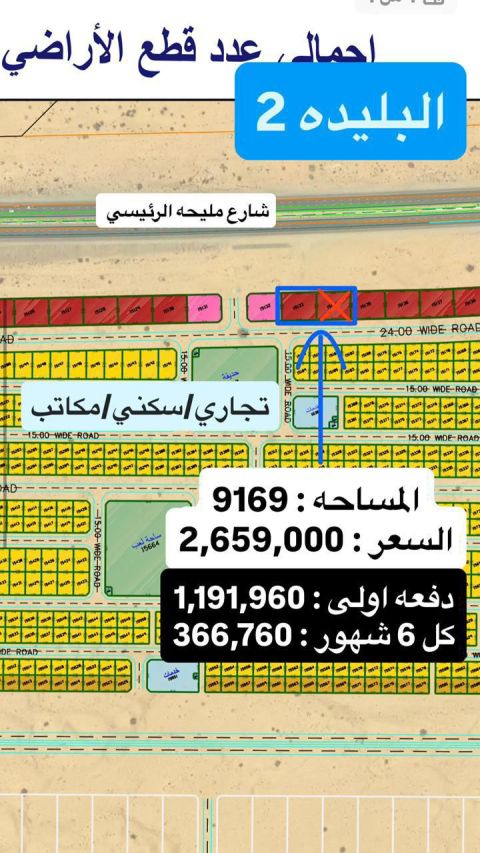 Commercial Land for sale - Blida 2, Sharjah - Area 9169 ft - Total price AED2659000 - Down Payment AED1191960 - Installments every 6 months AED366760 - Location Mleiha Main Street Excellent investment opportunity for commercial land in a vital location in Blida 2