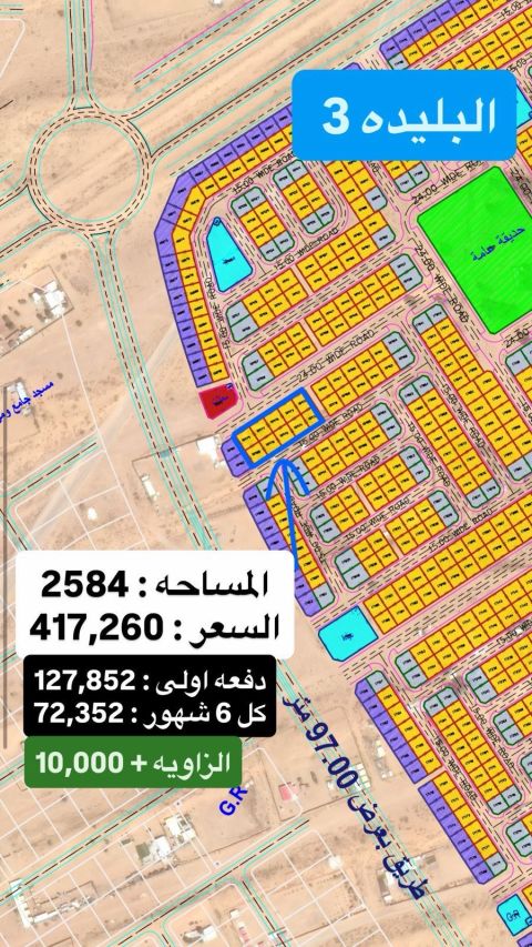For sale 4 adjacent pieces in a privileged location within the Blida 3 project, suitable for residential construction with a flexible payment plan. Normal pieces (3 pieces) Area 2585 ft per plot - Price AED412500 - Down Payment AED123000 - Remaining AED289500 - Payment 2 years - 4 payments every 6 months - The payment amount 72380 dirhams Angle piece Area 2581 ft - Price 450000