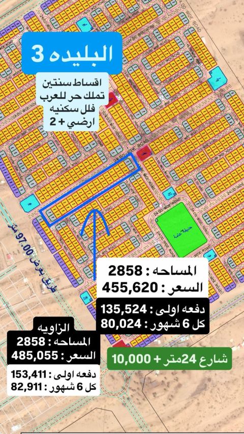 Residential land for sale in Al Balida 3, Sharjah Land area 2858 SqFt Prime location, close to the public park. Building permit for a ground floor + 2 floors villa. Installments over two years. Quarterly installment AED82911. Down payment AED153411. Total price AED485055 only