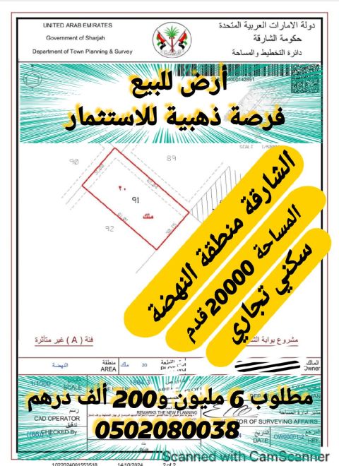 Land for sale in Al Sajaa/ Behind Al Saha S Area 10800 SqFt Electricity 25 KV Old income - generating scheme Three - year lease expires in one month asking price 1900000 Mohammed Ibrahim/ Al Basma