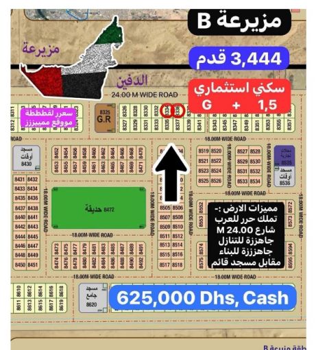 Land for sale in Al Sahma area Sharjah Emirate Prime location on 18th Street, close to the mosque Land area 2836 SqFt. Residential permit Ground + 2 floors Freehold ownership for Arab brothers asking price AED395000. For inquiries and contact, call the number provided