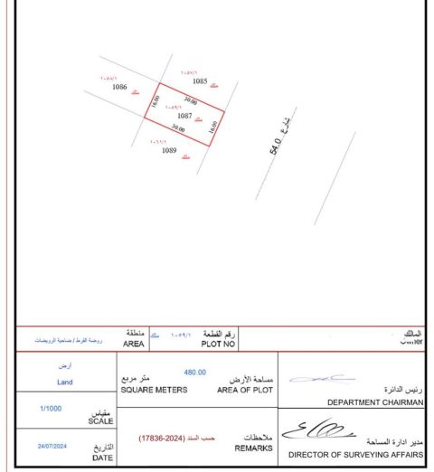 This plot boasts an exceptional location in the Al - Ruqeiba area, situated on the corner of two streets, one of which is main road No. 97. It is conveniently close to Al Suyoh Mosque, directly facing the Masaar project and behind the Nasma project, making it an ideal opportunity for housing or investment. The permit allows for the construction of a residential villa consisting of a ground floor and