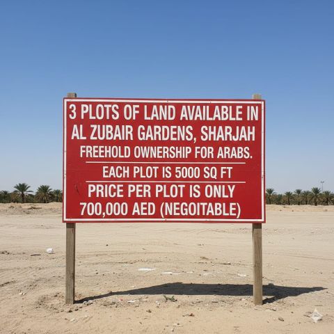 Residential Plots for sale - Basateen Al Zubair, Sharjah Freehold for Arabs A prime investment opportunity to own 3 residential plots in a strategic location at Basateen Al Zubair - Sharjah. You can buy a single plot or benefit from a special price when purchasing all three together. Plot Details Location Basateen Al Zubair - Sharjah Number of plots 3 available Size per plot 5000 SqFt Ownership