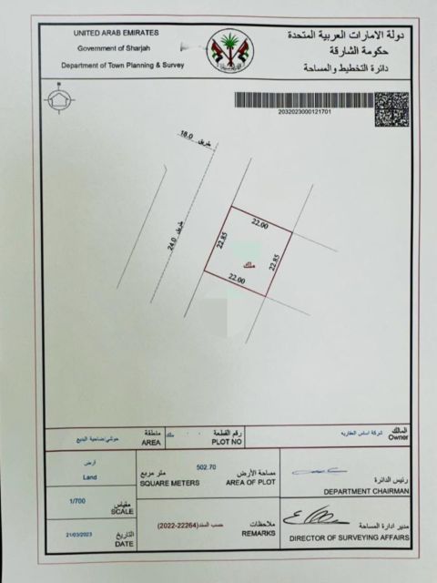 For sale Residential - Commercial Plot on a 36m Road in Muzairah - Al Rahmaniya District - Emirate of Sharjah Area 5331 SqFt Building Permit Ground Floor + Mezzanine + First Floor Contact