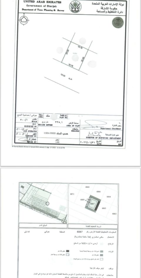 For sale in Sharjah Location Tay East Type Residential Land Area 7179 SqFt Building Permit Villa (Ground + First Floor) Road 25 - meter asphalt road Ownership Freehold for all Arab nationalities Features Very prime location Close to Maliha Road Near the mosque easy access and exit Price AED1250000 We provide our services across all areas of the Emirate of Sharjah