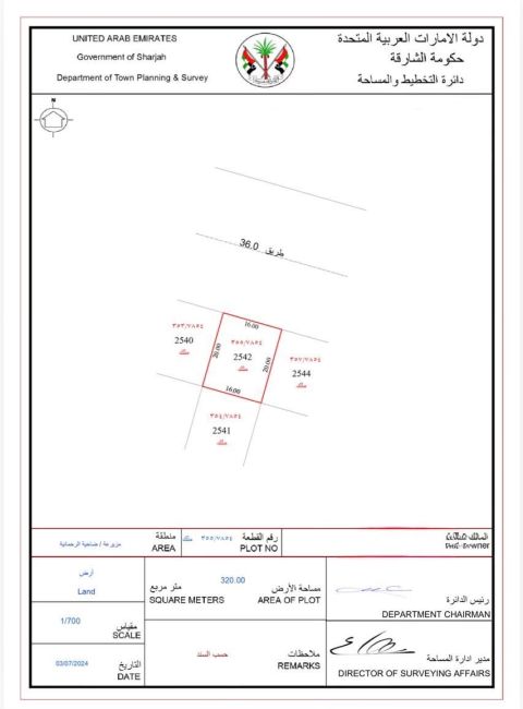 Excellent Investment Opportunity In Sharjah - Al Zubair Gardens - Residential Land Area 4843 SqFt. Building Permit Residential Villa, Ground + Two Floors Ownership Freehold for all Arab nationalities Land Features The land is ready for construction Prime location near the mosque and park asking price AED660000 cash Company Future Home real estate