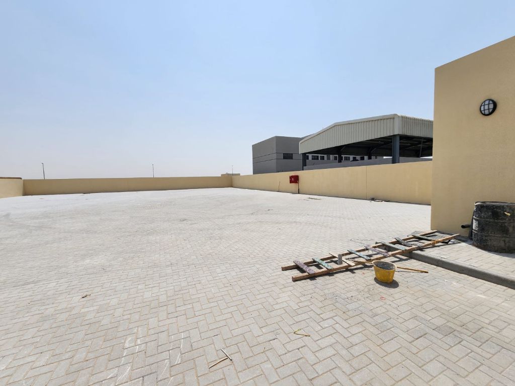 For rent, a fenced plot of land in the Al Sajaa Industrial Area, Al Hanou Al Jalil, Sharjah. The area is approximately 14000 square feet (1350 SQM) It includes interlocking floors, a room, a kitchen, and a bathroom. It is located on an asphalt street near Emirates Road. Electricity is 30 kilowatts. Contact