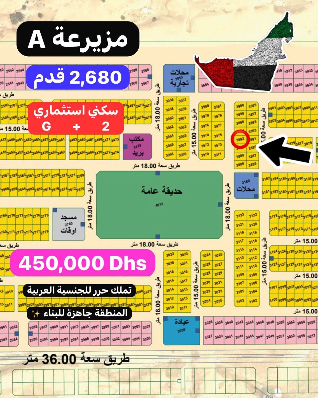 Land for sale - Al Muzairah Area Freehold for All Arab Nationalities Great investment opportunity in a quiet and promising location. Plot Size 2680 SqFt Price AED450000 The land is ready for construction, ideal for residential or investment use. Freehold ownership for all Arab nationalities