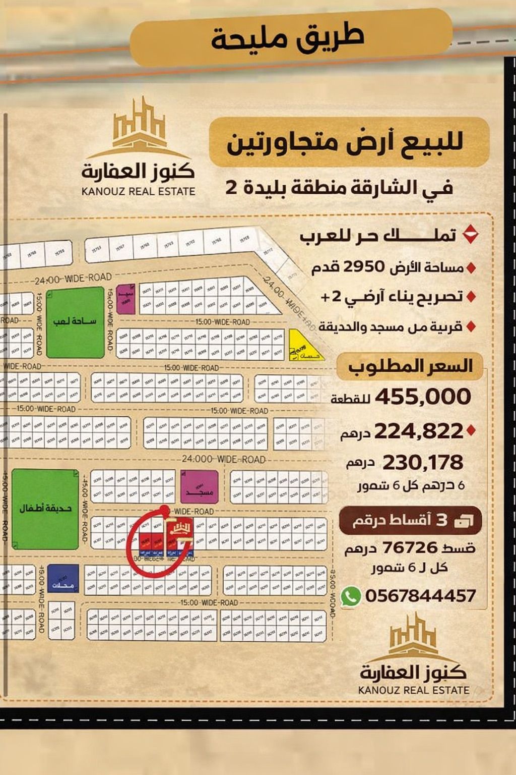للبيع أرضين متجاورات في الشارقة منطقة باليدة 2 تملك حر للعرب مساحة الأرض 2950 قدم تصريح بناء أرضي + 2 قريبة من المسجد والحديقة والخدمات السعر المطلوب 455000 للقطعة دفعة أولى 224822 درهم 3 اقساط 230178 كل قسط 76726 درهم كل 6 شهور