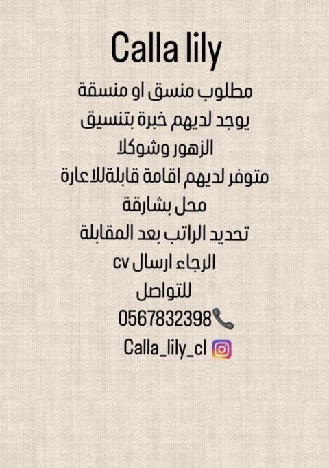 مطلوب منسق زهور ذو خبرة للعمل في محل زهور في الشارقة